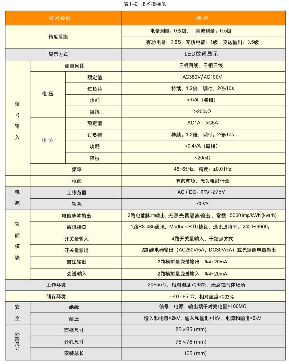 多功能電力監(jiān)測儀表是一種具有可編程測量,綜合顯示三相電參量、電能計量、數(shù)字通訊功能于一體的智能化儀表。能夠完成電量測量、電能計量、數(shù)據(jù)顯示、采集及傳輸,可廣泛應(yīng)用于變電站自動化、配電自動化、智能建筑、企業(yè)內(nèi)部電能計量、管理、考核。測量精度為0.5S級,實現(xiàn)現(xiàn)場顯示和遠(yuǎn)程RS-485數(shù)字接口通訊、采用Modbus-RTU通訊協(xié)議。